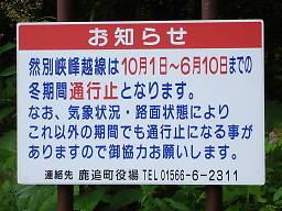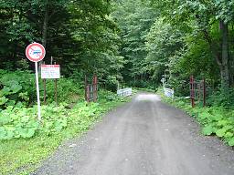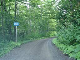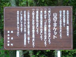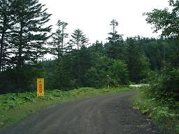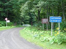 然別峡野営場から約2.5kmほどのところに分岐があり(写真10)、左折するとユーヤンベツ林道、右へ行くと町道然別峡峰越線で、然別峡峰越線側には「山のエチケット」や冬期間通行止の看板が立っている(写真13、14)。